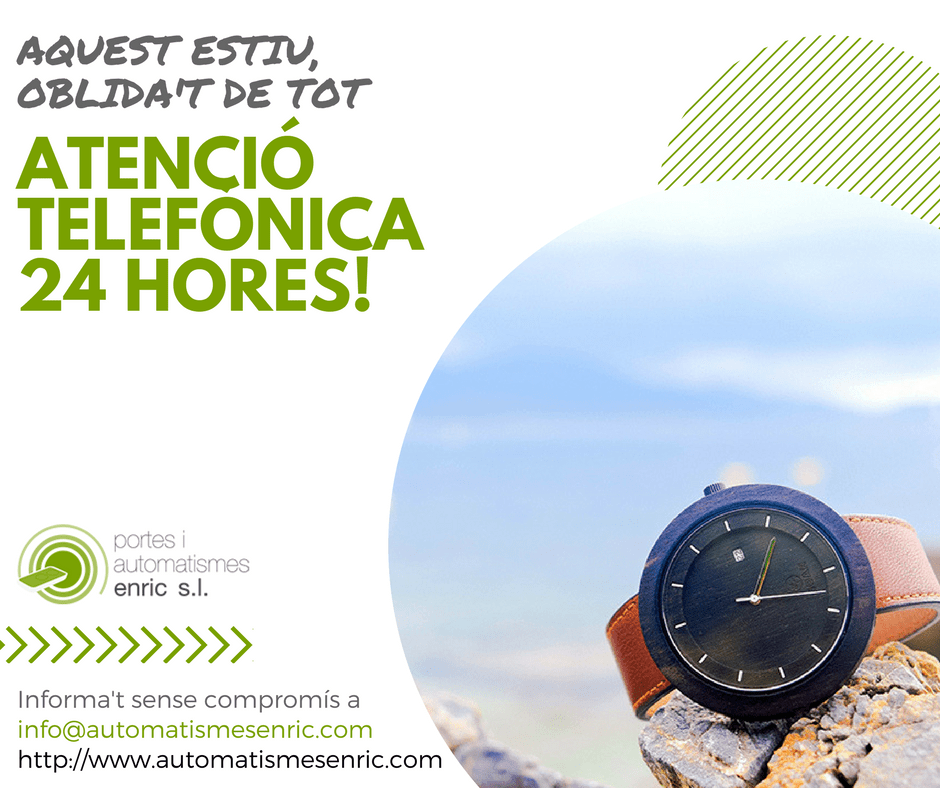 Pensa que gràcies al nostre Servei d'Atenció Telefònica 24 hores, estem sempre pendents de tu i de les teves portes i persianes automatitzades. Per aquest motiu, si has de marxar de vacances i tens problemes amb la teva porta ¡no pensis, ni per un moment, en perdre o endarrerir el teu període de desconnexió! Amb el nostre servei de manteniment tens la possibilitat de marxar i ¡trucar-nos des d'on vulguis! Nosaltres acudirem a solucionar els teus problemes.